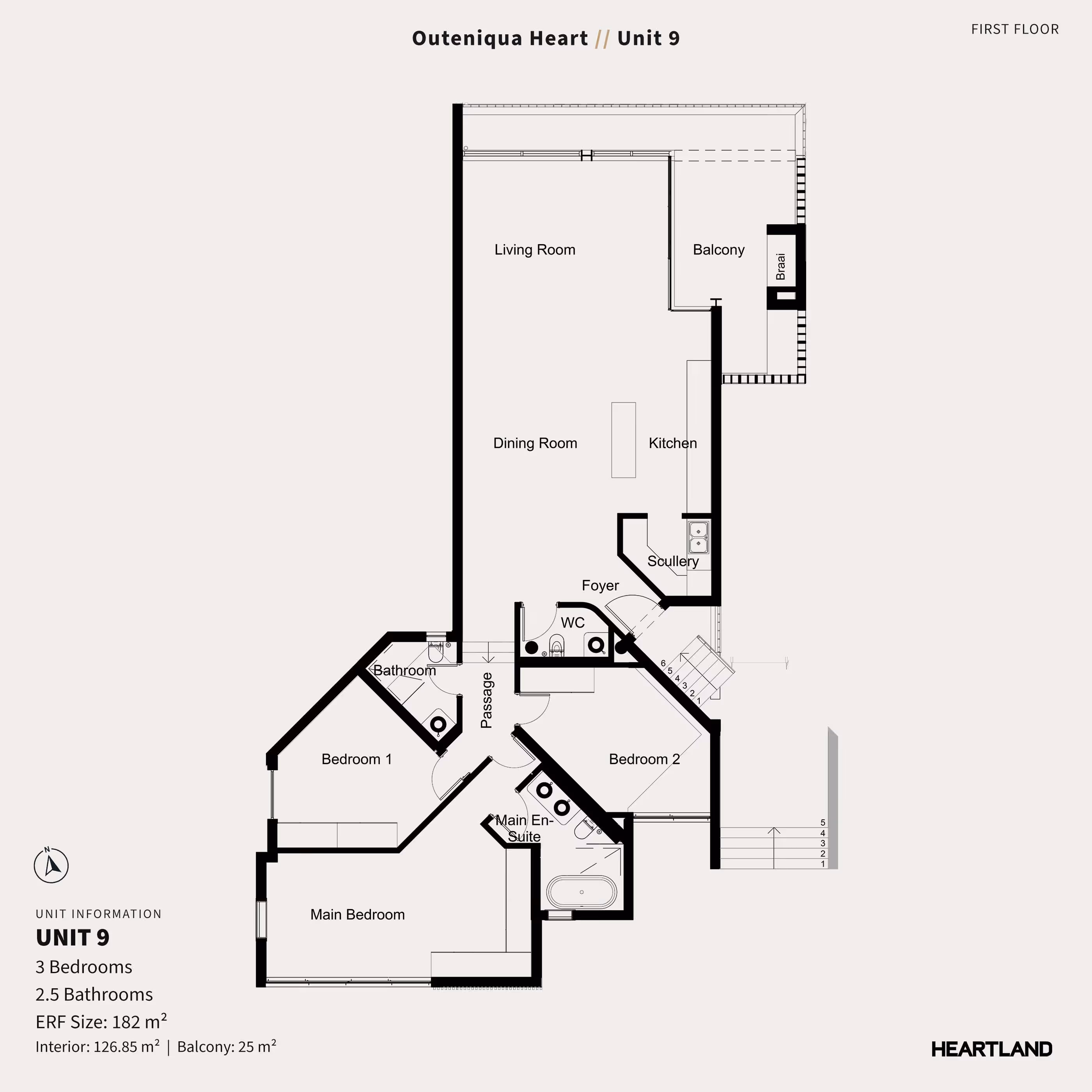 ERF Size: 182 m² Unit Size: 170 m² Balcony: 25 m² Est Levies: R2,878.20 Est Rates: R1,761.88